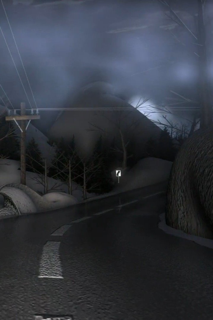 This animated short evokes the experience of driving alone on an unlit rural road at night. Darkness is broken by the beam of headlights, creating dancing shadows that obscure what lies beyond the road.