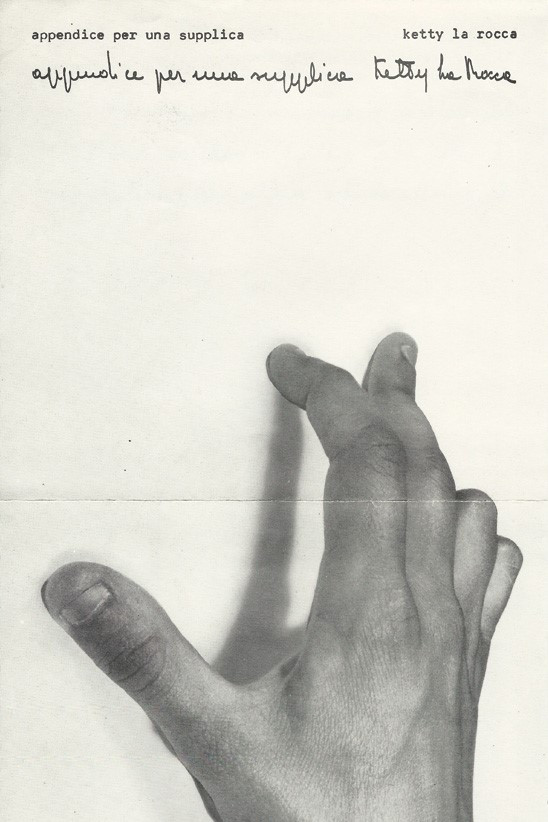 [Following overview courtesy of Art Basel] Appendice per una supplica shows a pair of male and female hands against a black background gesticulating an entire repertoire of possible meanings and interpersonal tensions. The film reveals La Rocca’s attempt at developing a language that is not pre-coded by society. This dealing with the social construction of meaning was influenced by her work for Italian television, where she created and presented shows for deaf-mute persons. It is the very first film in art history showing manual gestures.